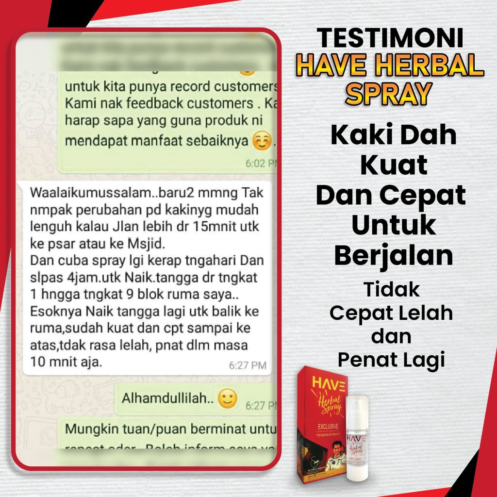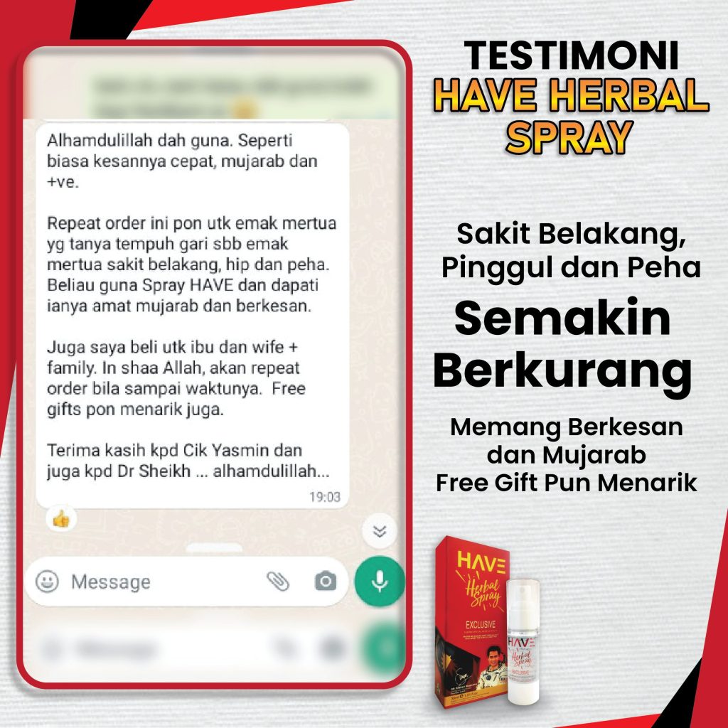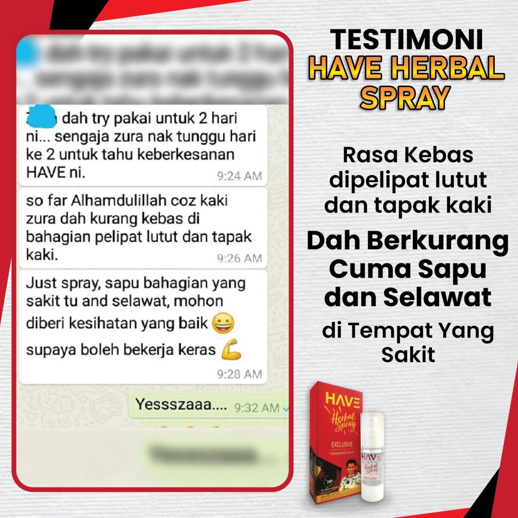 Insyallah, produk ni instant effect. Kebiasaan lepas apply je 10 saat akan merasakan perubahan pada lutut. Dengan teknologi ‘Nano Herba’ yang digunakan dalam HAVE melegakan terus punca sakit lutut tanpa mengharapkan ubat tahan sakit.